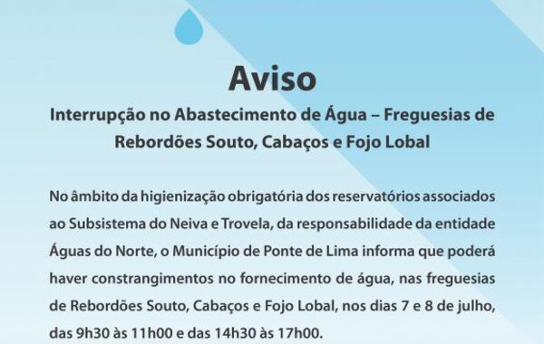 AVISO: Interrupção no Abastecimento de Água – Freguesias de Rebordões Souto, Cabaços e Fojo Lobal