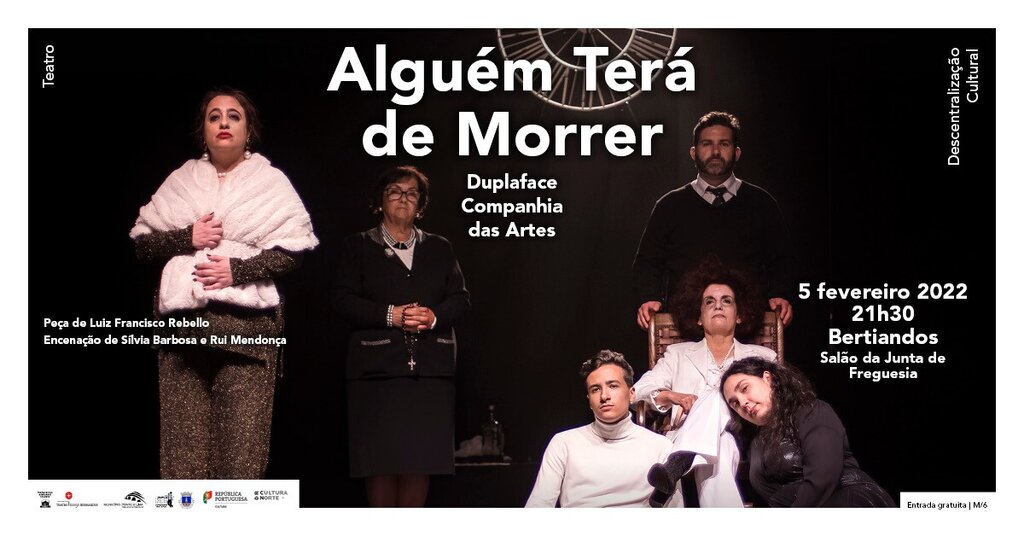 A 5 de fevereiro, às 21h30, no Salão da Junta de Freguesia de Bertiandos, com entradas gratuitas e lotação limitada, espetáculo de teatro, "Alguém Terá de Morrer", pela DUPLAFACE – Companhia das Artes