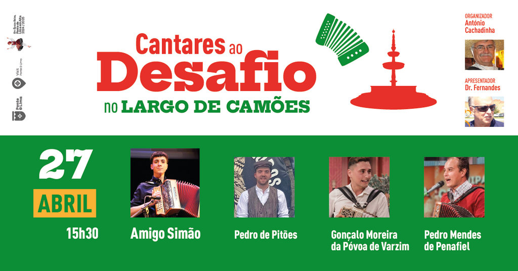 Domingo, dia 27 de abril de 2025, às 15h30, Cantares ao Desafio com Amigo Simão, Pedro de Pitões, Gonçalo Moreira da Póvoa de Varzim e Pedro Mendes de Panafiel, no Largo de Camões.