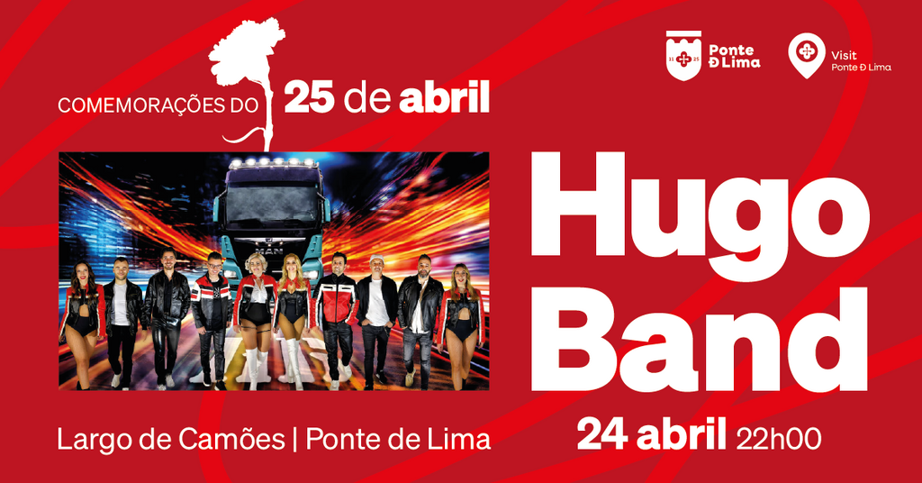 Inserido nas comemorações do 25 de Abril, o Município de Ponte de Lima recebe no dia 24 de abril, no Largo de Camões, pelas 22 horas, o espetáculo musical/baile pelo Grupo Hugo Band, que proporcionará aos limianos e público em geral, que habitualmente visitam esta vila, um espetáculo cheio de alegria, cor e dinamismo.