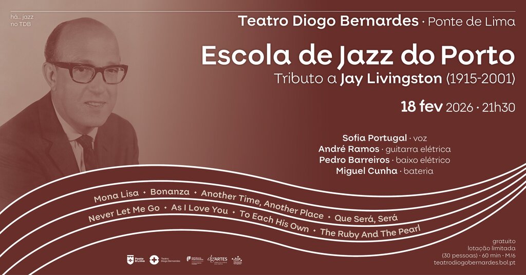 No dia 18 de fevereiro de 2026, às 21h30, o Teatro Diogo Bernardes, em Ponte de Lima, apresenta o espetáculo de Jazz, Há... Jazz no TDB – Tributo ao compositor Jay Livingston (1915-2001) pela Escola de Jazz do Porto.