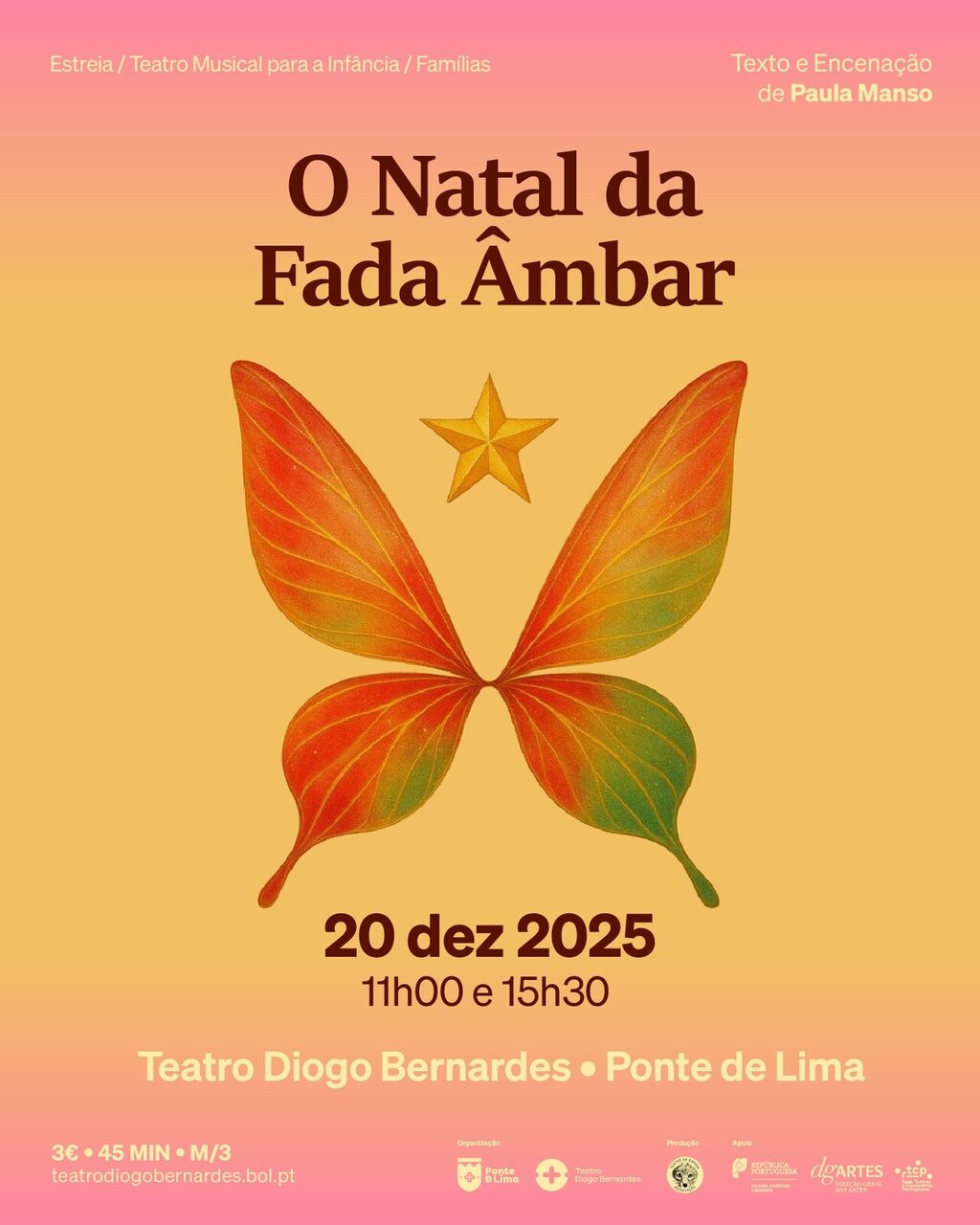 No dia 20 de dezembro de 2025, às 11h00 e às 15h30, o Município Ponte de Lima apresenta no Teatro Diogo Bernardes, em estreia, o espetáculo de teatro musical para Infância, famílias, “O Natal da Fada Âmbar”, com texto e encenação de Paula Manso | Teatro da Raposa.