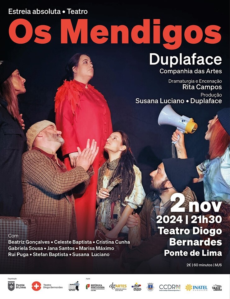 No dia 2 de novembro de 2024, às 21h30, o Teatro Diogo Bernardes apresenta, em estreia absoluta o espetáculo de teatro "Os Mendigos" pela Duplaface - Companhia das Artes.