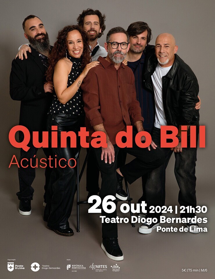 No dia 26 de outubro de 2024, às 21h30, o Teatro Diogo Bernardes em Ponte de Lima apresenta, o espetáculo de música "Acústico" Quinta do Bill.