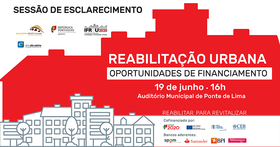 Com o propósito de divulgar todas as componentes associadas a este programa de apoio e esclarecer presencialmente todas as dúvidas, realiza-se, no dia 19 de junho, terça-feira, pelas 16h00, no Auditório Municipal de Ponte de Lima, uma sessão de esclarecimento sobre este instrumento financeiro de apoio à reabilitação urbanística.
