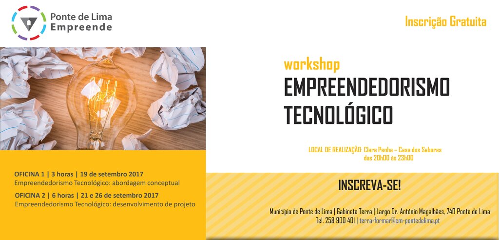 O Município de Ponte de Lima promove o workshop Empreendedorismo Tecnológico, a decorrer nos dias 19, 21 e 26 de setembro, na Clara Penha - Casa dos Sabores.