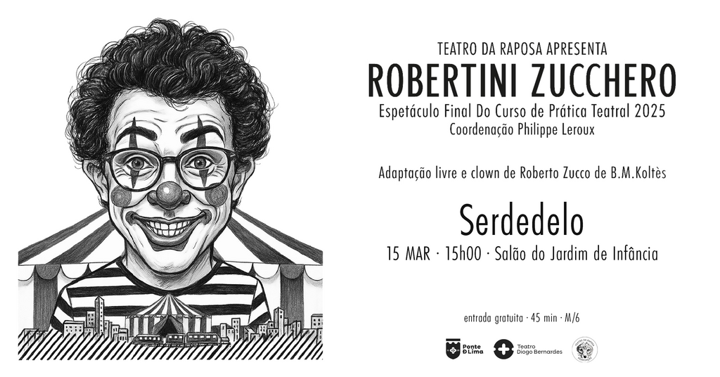 No dia 15 de março de 2026, às 15h00, o Município de Ponte de Lima e o Teatro da Raposa apresentam o espetáculo final do curso de prática teatral "Robertini Zucchero", no salão do Jardim de Infância de Serdedelo.