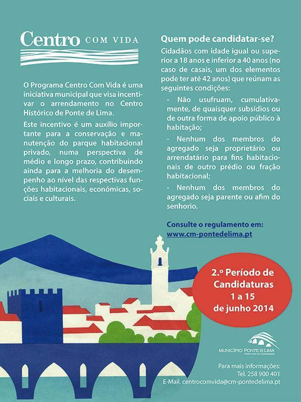 O Programa Centro Com Vida é uma iniciativa municipal que visa incentivar o arrendamento no Centro Histórico de Ponte de Lima. O 2º Período de Candidaturas decorre entre 1 e 15 de junho de 2014.