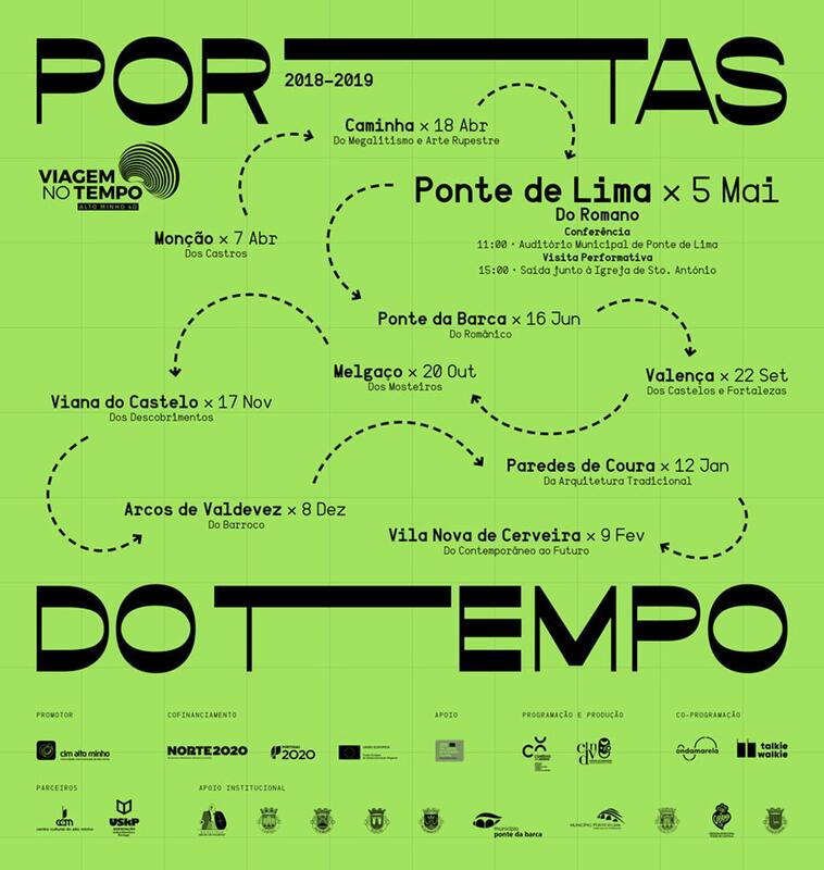 Depois de Ponte de Lima, as Portas do Tempo serão abertas nos restantes sete concelhos do Alto Minho, dinamizando uma atividade por mês em cada município. Assim, no dia 16 de junho, Ponte da Barca acolhe a “Rota do Românico”; no dia 22 de setembro, Valença recebe a “Rota dos Castelos e Fortalezas”; Melgaço, no dia 20 de outubro, a “Rota dos Mosteiros”; Viana do Castelo, a 17 de novembro, a “Rota dos Descobrimentos”; Arcos de Valdevez, no dia 8 de dezembro, a “Rota do Barroco”; Paredes de Coura, a 12 de janeiro de 2019, a “Rota da Arquitetura Tradicional”; e, finalmente, a viagem termina em Vila Nova de Cerveira, no dia 9 de fevereiro do próximo ano, com a “Rota do Contemporâneo ao Futuro”.