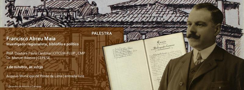 O Arquivo Municipal de Ponte de Lima promove a 2 de outubro, às 21h30 uma palestra intitulada "Francisco Abreu Maia: investigador regionalista, bibliófilo e político", que conta com a presença da Doutora Paula Cardona, investigadora do CITCEM da Faculdade de Letras da Universidade do Porto e técnica superior da Câmara Municipal do Porto, e do Dr. Manuel Ribeiro, investigador do CEPESE.