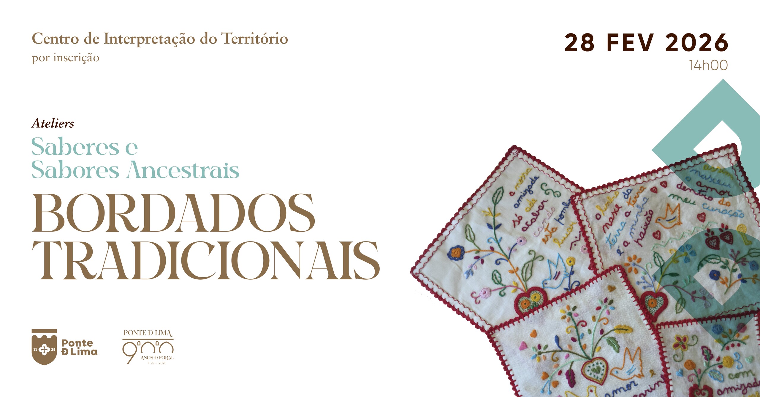 No âmbito das comemorações dos 900 anos do Foral Teresiano, o Centro de Interpretação do Território (CIT) – espaço de promoção etnográfica do Município de Ponte de Lima – convida famílias, amigos e casais de namorados a participar num atelier dedicado à aprendizagem e bordadura dos tradicionais lenços de amor – manifestação artesanal, de carácter popular, cuja origem poderá remontar ao século XVIII.