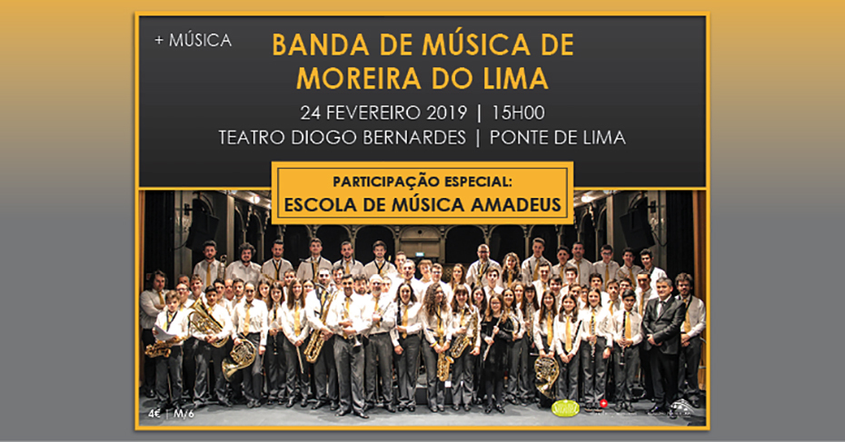 A 24 de fevereiro, às 15h00, no Teatro Diogo Bernardes, em Ponte de Lima, Concerto pela Banda de Música de Moreira do Lima, com a participação especial da Escola de Música Amadeus - segundo de quatro concertos a realizar pelas Bandas Filarmónicas do Concelho de Ponte de Lima, no Teatro Diogo Bernardes, em 2019.