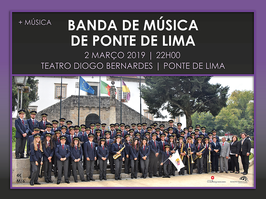 A 2 de março, às 22h00, no Teatro Diogo Bernardes, em Ponte de Lima, Concerto pela Banda de Música de Ponte de Lima - terceiro de quatro concertos a realizar pelas Bandas Filarmónicas do Concelho de Ponte de Lima, no Teatro Diogo Bernardes, em 2019.