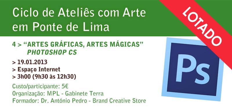 Artes Gráficas, Artes Mágicas" - Photoshop CS é o tema da próxima sessão do Ciclo de Ateliês com Arte, a realizar a 19 de janeiro. Inscrições ou mais informações podem ser obtidas através do email: terra@cm-pontedelima.pt ou telf.: 258 900401.