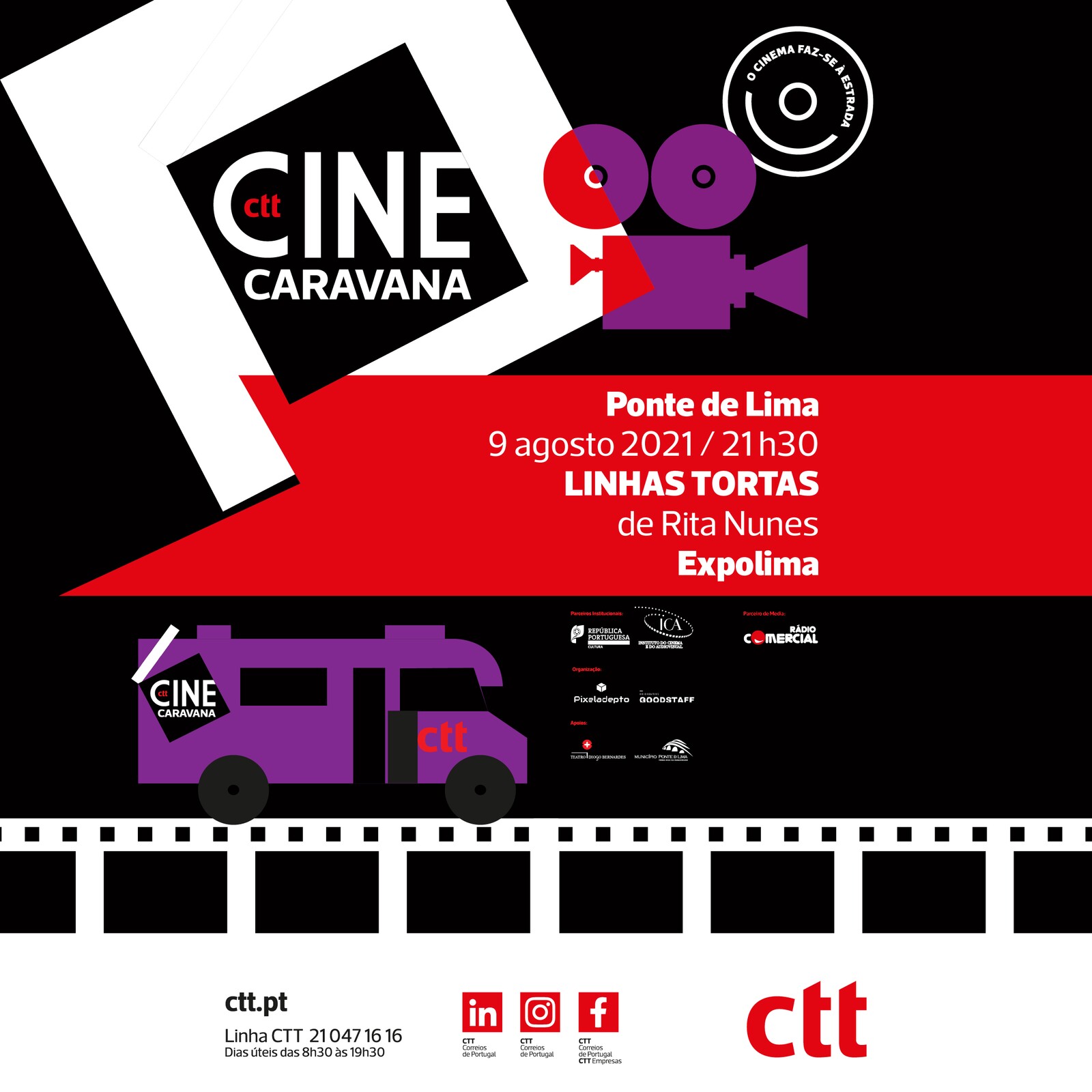A proposta de cinema ao ar livre, Cine-Caravana: o cinema faz-se à estrada!, em Ponte de Lima, vai realizar-se no dia 9 de agosto, segunda-feira, às 21h30, na Expolima, com entrada gratuita e lotação limitada, com a exibição do filme português “Linhas Tortas”, de Rita Nunes. Classificação etária: M/12.