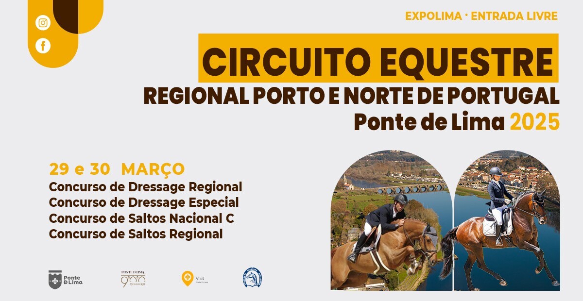 Integrado no Circuito Equestre Regional Porto e Norte de Portugal, realiza-se em Ponte de Lima, no fim de semana de 29 e 30 de março de 2025 o Concurso de Dressage Regional, Concurso Dressage Especial, Concurso de Saltos Nacional C e o Concurso de Saltos Regional.