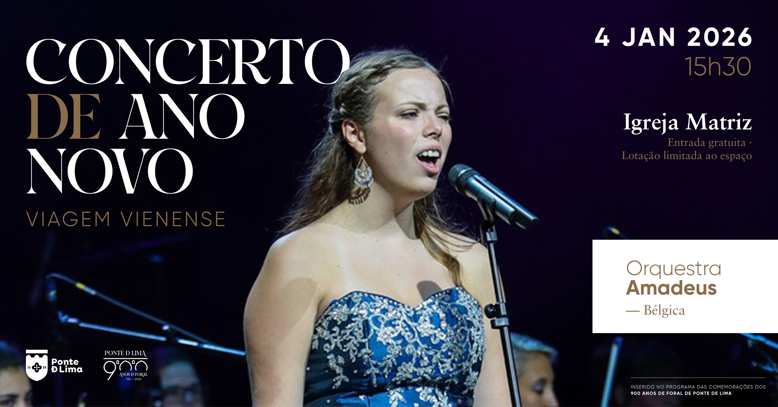 Integrando-se nas Comemorações dos 900 Anos da outorga do Foral a Ponte de Lima (1125), a Orquestra Amadeus, sob a direção de Pascal Donzé, apresenta um grandioso concerto que reverencia a solenidade e o esplendor da tradição vienense de Ano Novo.