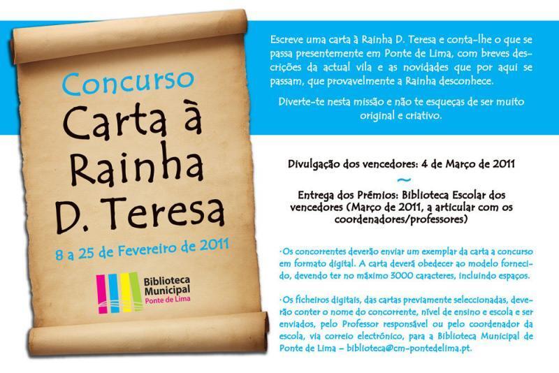 No âmbito da comemoração do Dia de Ponte de Lima 2011 a Biblioteca Municipal leva a cabo o concurso sob o tema "Carta à Rainha D. Teresa", que visa assinalar este dia e estimular o gosto pela escrita criativa. Desafia-se os participantes..