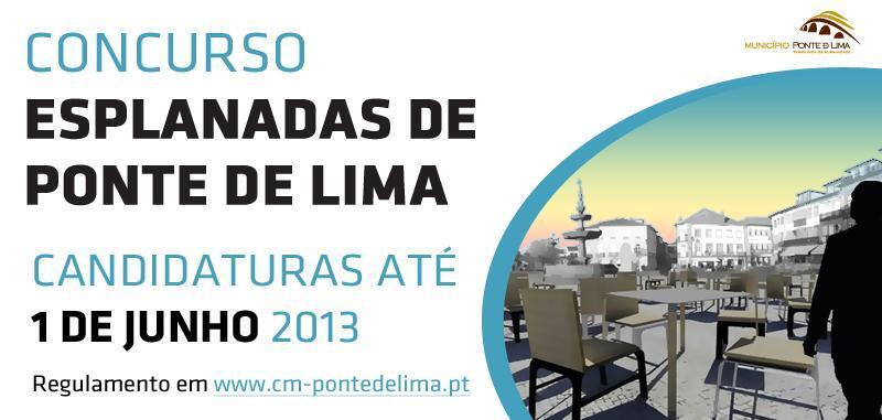 Encontra-se aberto o Concurso "Esplanadas de Ponte de Lima" destinado a todos os proprietários de estabelecimentos com esplanadas circunscritas no concelho, mediante o envio ou entrega da candidatura até ao dia 1 de junho de 2013. Participe!
