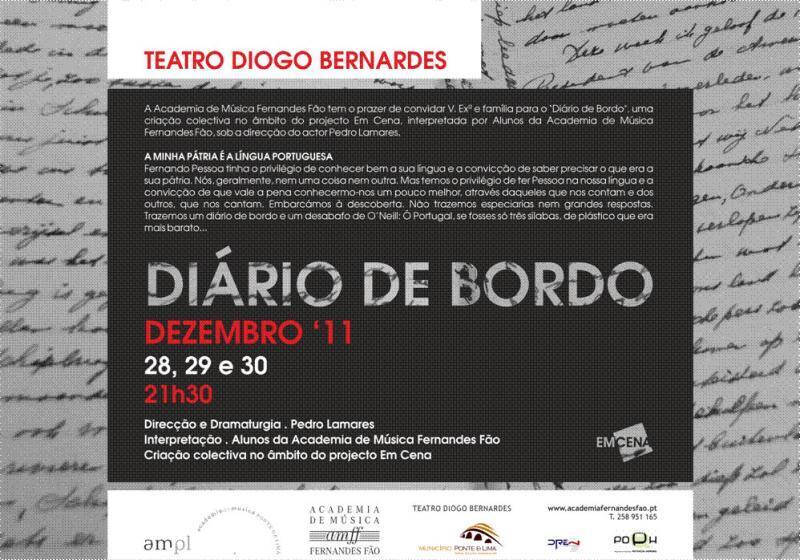 A Academia de Música Fernandes Fão tem o prazer de convidar V. Exª e família para o "Diário de Bordo", uma criação coletiva no âmbito do projeto em cena. Interpretada por Alunos da Academia de Música Fernandes Fão, sob a direção do ator Pedro Lamares.