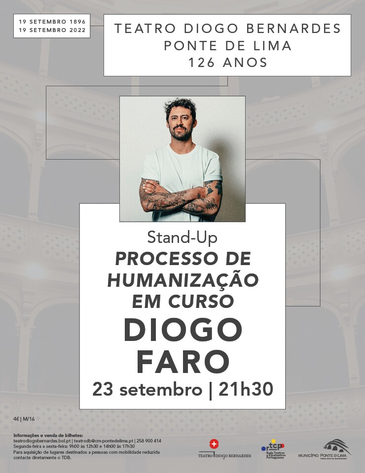 A 23 de setembro de 2022, às 21h30, o Teatro Diogo Bernardes em Ponte de Lima apresenta, o espetáculo de stand-up “Processo de Humanização em Curso” | Diogo Faro.