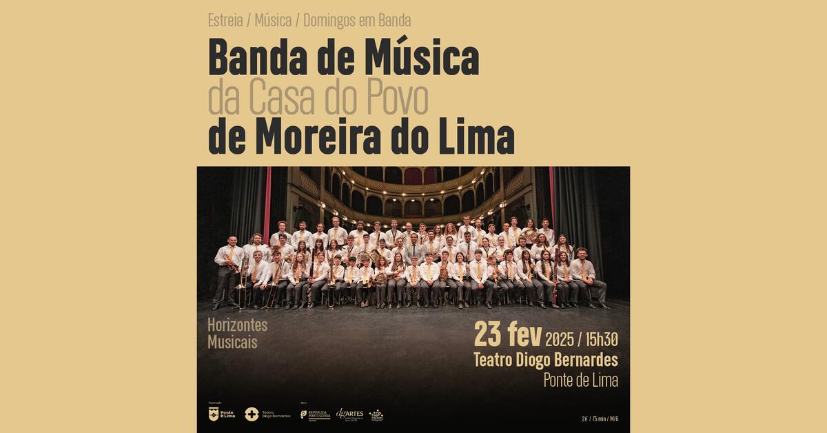 No dia 23 de fevereiro de 2025, às 15h30, o Teatro Diogo Bernardes apresenta, o espetáculo de música, Domingos em Banda pela Banda de Música da Casa do Povo de Moreira do Lima "Horizontes Musicais".