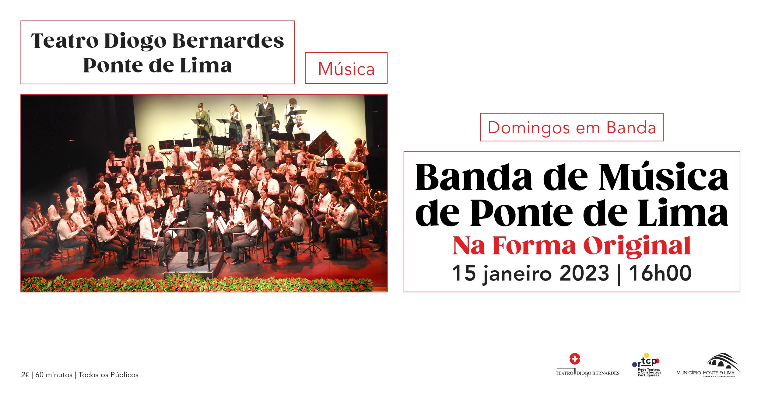 No dia 15 de janeiro de 2023, às 16h00, o Teatro Diogo Bernardes em Ponte de Lima apresenta, os Domingos em Banda com o concerto da Banda de Música de Ponte de Lima "Na Forma Original".