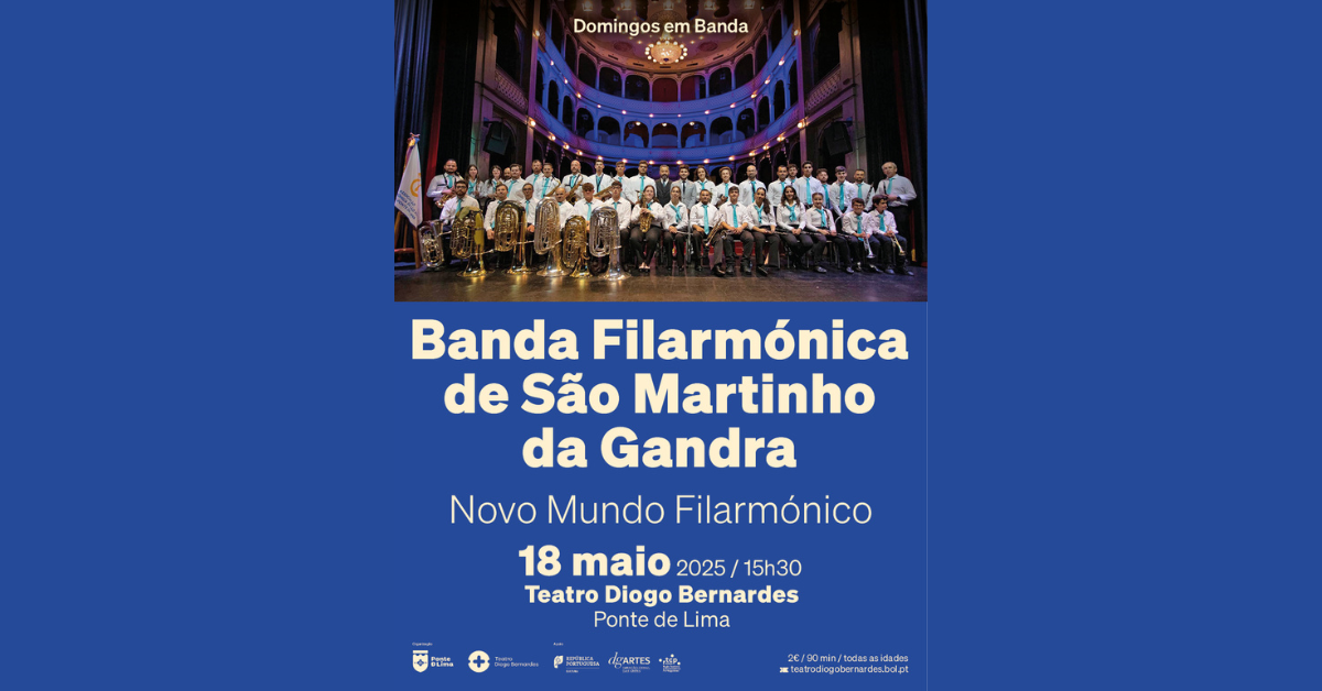 No dia 18 de maio de 2025, às 15h30, o Município Ponte de Lima apresenta no Teatro Diogo Bernardes, o espetáculo de Música/Concerto, Domingos em Banda | Banda Filarmónica S. Martinho da Gandra “Novo Mundo Filarmónico”.
