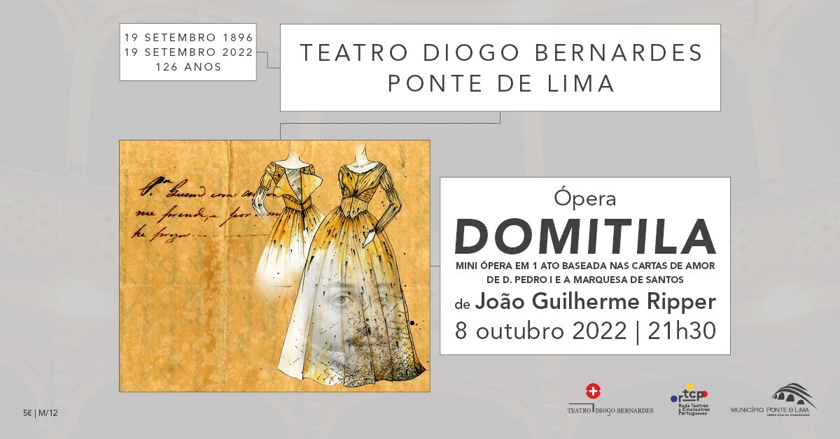 A 8 de outubro de 2022, às 21h30, o Teatro Diogo Bernardes em Ponte de Lima apresenta, o espetáculo de Ópera "Domitila: Ópera de Câmara em um ato baseada nas cartas de D. Pedro I e Marquesa de Santos", de João Guilherme Ripper | Mestres Viajantes.