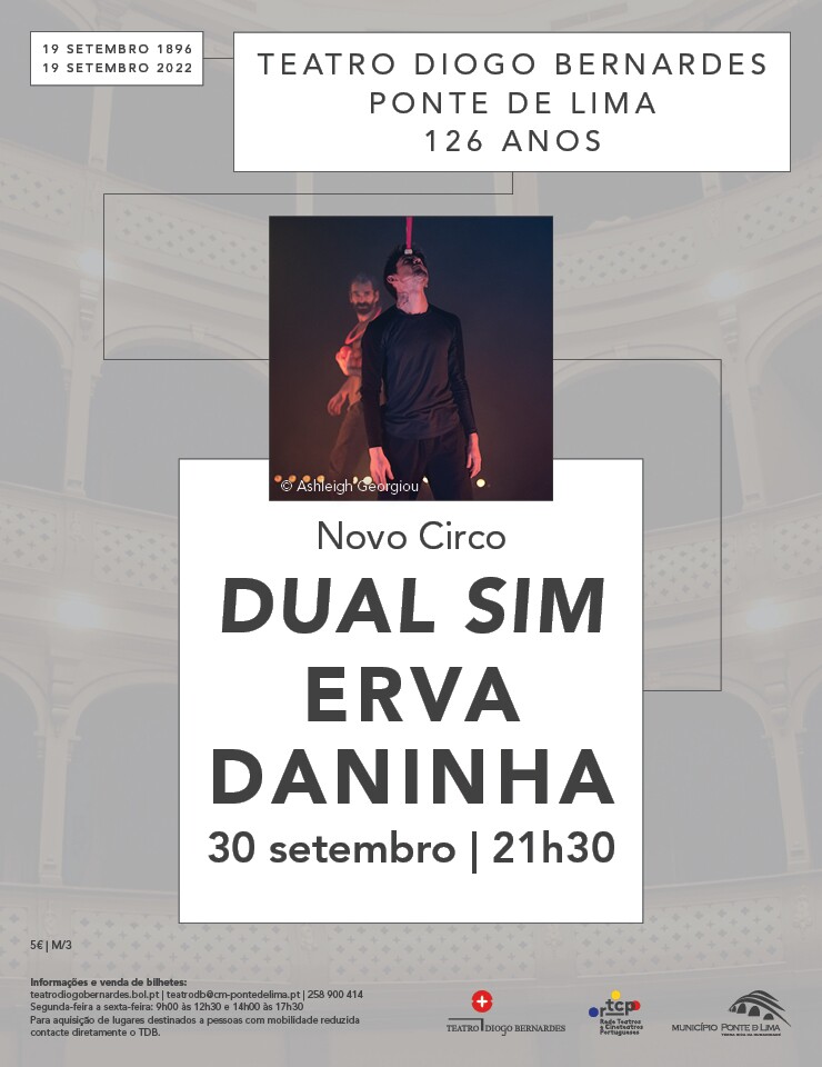 A 30 de setembro de 2022, às 21h30, o Teatro Diogo Bernardes em Ponte de Lima apresenta, o espetáculo de novo circo “Dual SIM” | Erva Daninha.