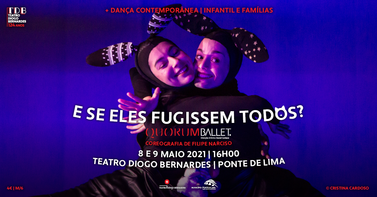 Nos dias 8 e 9 de maio de 2021, às 16h00, no Teatro Diogo Bernardes, em Ponte de Lima, espetáculo de dança contemporânea infantil "E Se Eles Fugissem Todos?", pelo Quorum Ballet.