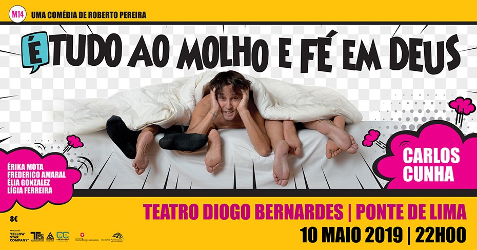 A 10 de maio, às 22h00, no Teatro Diogo Bernardes, em Ponte de Lima, a Comédia É Tudo ao Molho e Fé em Deus, de Roberto Pereira, com Carlos Cunha, Érika Mota, Frederico Amaral, Elia Gonzales e Lígia Ferreira.