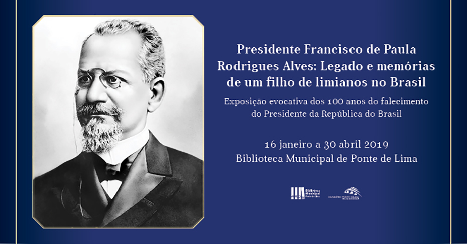 Intitulada “Presidente Francisco de Paula Rodrigues Alves: Legado e memórias de um filho de limianos no Brasil”, a mostra de tributo - patente ao público na varanda interior da Biblioteca Municipal de Ponte de Lima de 16 de janeiro a 30 de abril de 2019 - possibilitará aos visitantes o contacto com informação, fotografias e documentação alusivas a este distinto advogado e notável político, que conseguiu alcançar nobres cargos e exercer funções como Vereador, Deputado, Conselheiro do Império, Ministro, Senador e Presidente da República do Brasil.