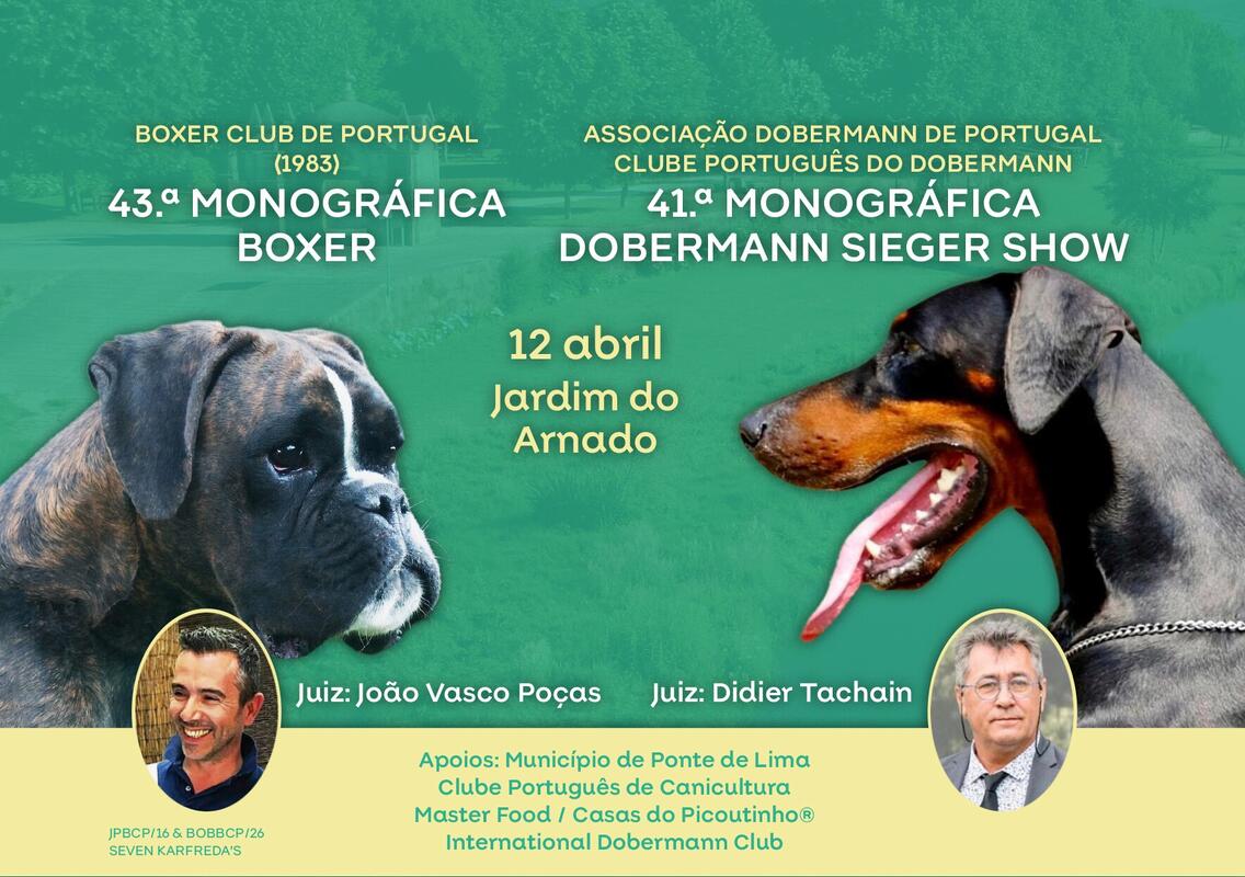 No dia 12 de abril, Ponte de Lima será palco de duas grandes exposições monográficas imperdíveis: 43.ª Monográfica Boxer e 41.ª Monográfica Dobermann Sieger Show.