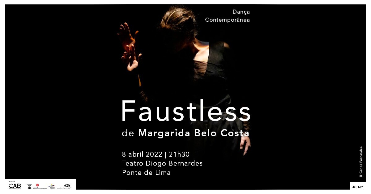 A 8 de abril de 2022, às 21h30, o Teatro Diogo Bernardes em Ponte de Lima, apresenta o espetáculo de Dança Contemporânea "Faustless, de Margarida Belo Costa".