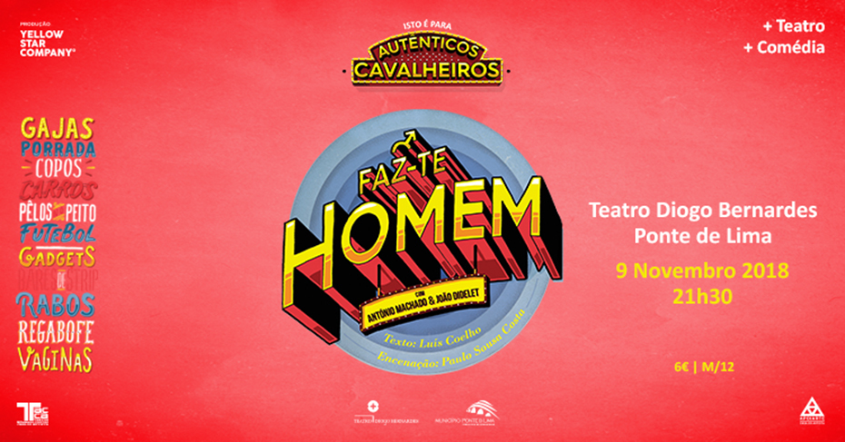 A 9 de novembro, às 21h30, no Teatro Diogo Bernardes, em Ponte de Lima, a comédia Faz-te Homem, texto de Luís Coelho, com João Didelet e António Machado e encenação de Paulo Sousa Costa.