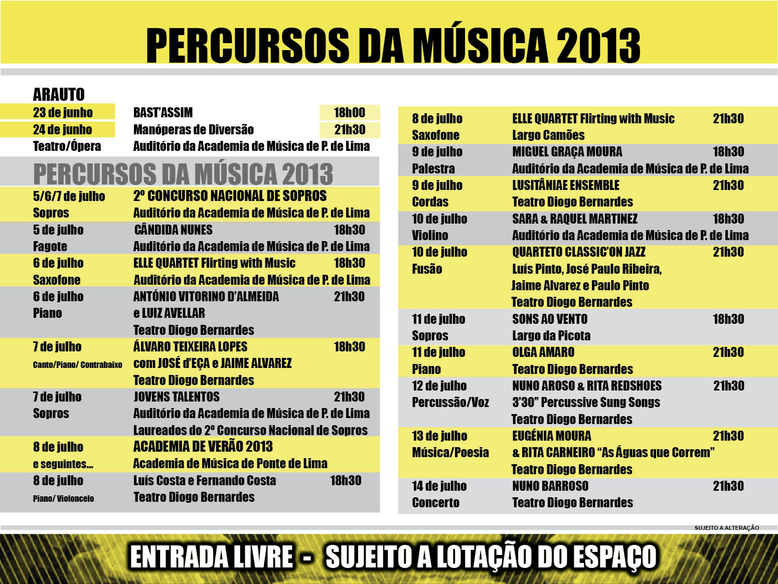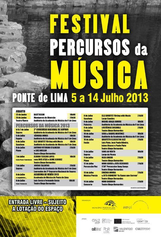 Festival abrangente de diferentes géneros musicais e manifestações artísticas, desde o seu início, a edição 2013 conta com espetáculos nos domínios da música erudita, jazz, poesia lusófona, teatro, ópera e música ligeira, em atuações repartidas por diferentes locais, em recinto fechado e ao ar livre, da magnífica vila de Ponte de Lima, como o Teatro Diogo Bernardes, Auditório da Academia de Música, Largo Camões e Largo da Picota. Integra, igualmente, o 2º Concurso Nacional de Sopros que contou, em 2012, com dezenas de participantes de admirável nível de todo o país e a Academia de verão 2013, que agrega master classes com diversos músicos convidados, como Nuno Aroso, nas percussões e estágio de orquestra sinfónica e coro.