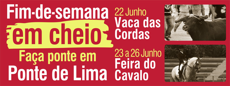 A tradicional corrida da "Vaca das Cordas" em Ponte de Lima realiza-se no dia 22 de junho, a partir das 18 horas. É uma tradição secular que atrai à Vila mais Antiga de Portugal milhares de forasteiros.