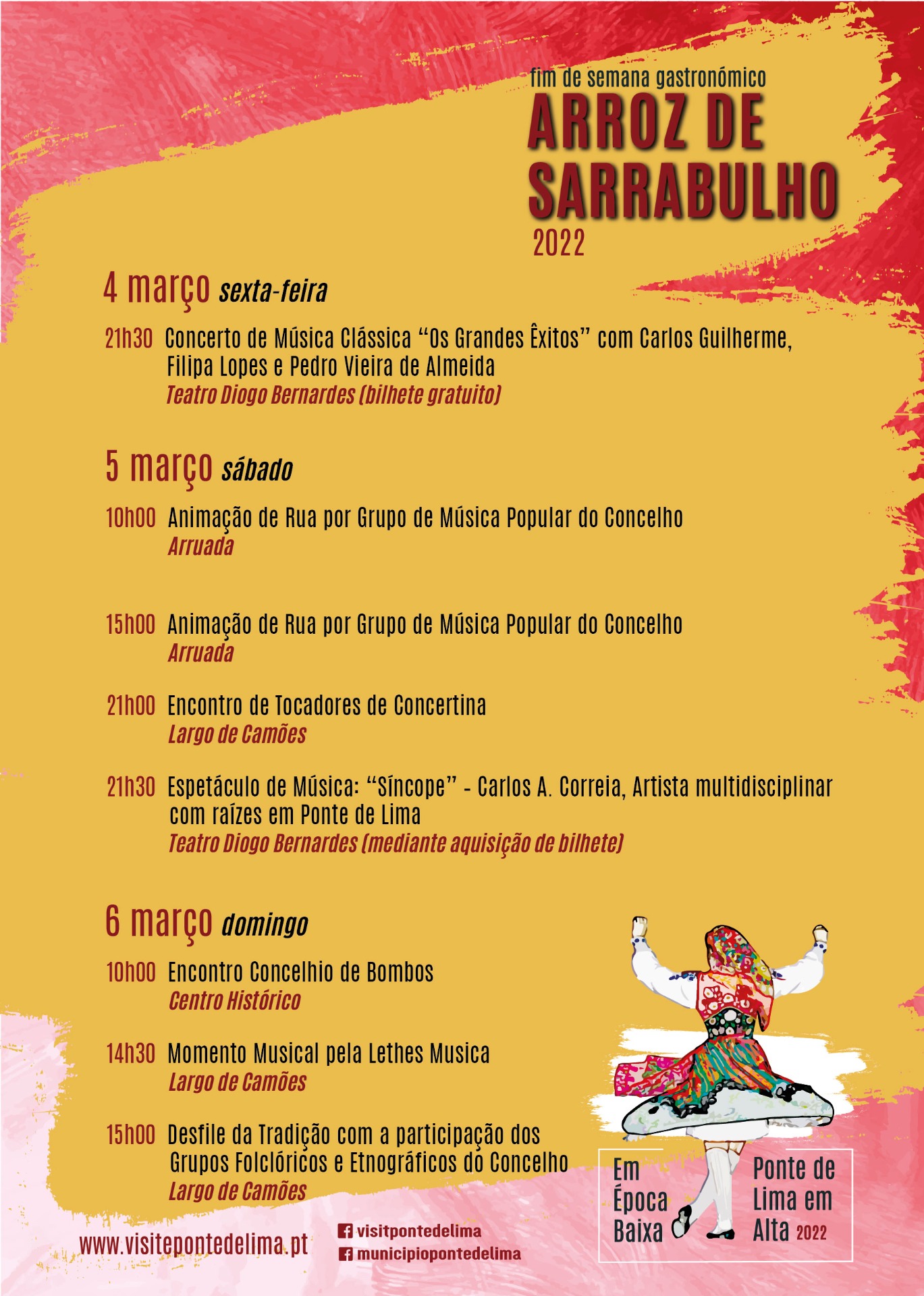 Ponte de Lima retoma a iniciativa “Fins de Semana Gastronómicos”, integrado no projeto “Em Época Baixa, Ponte de Lima em Alta22”, dirigido aos agentes locais e aos empresários do setor turístico hoteleiro e da restauração. Esta iniciativa abrange as campanhas especiais de alojamento, com 10% de desconto nas unidades hoteleiras aderentes, para as noites de sexta-feira e sábado, e oferta de um leite-de-creme por cada dose de sarrabulho, nos restaurantes aderentes, nas refeições de sábado e domingo.