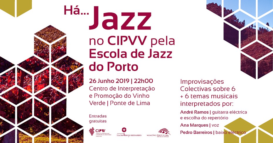 A 26 de junho, às 22h00, no CIPVV - Centro de Interpretação e Promoção do Vinho Verde, com entradas gratuitas, Há... Jazz no CIPVV, pela Escola de Jazz do Porto, com Improvisações colectivas sobre 6 + 6 temas musicais interpretados por: