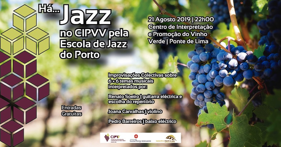 A 21 de agosto, às 22h00, no CIPVV - Centro de Interpretação e Promoção do Vinho Verde, com entradas gratuitas, Há... Jazz no CIPVV, pela Escola de Jazz do Porto, com Improvisações colectivas sobre 6 + 6 temas musicais interpretados por:
