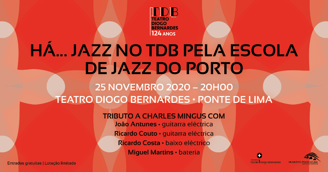 A 25 de novembro, às 20h00, no Teatro Diogo Bernardes, em Ponte de Lima, com entradas gratuitas e lotação limitada, Há... Jazz no TDB - Teatro Diogo Bernardes, a cargo da Escola de Jazz do Porto, com um Tributo a Charles Mingus, com: