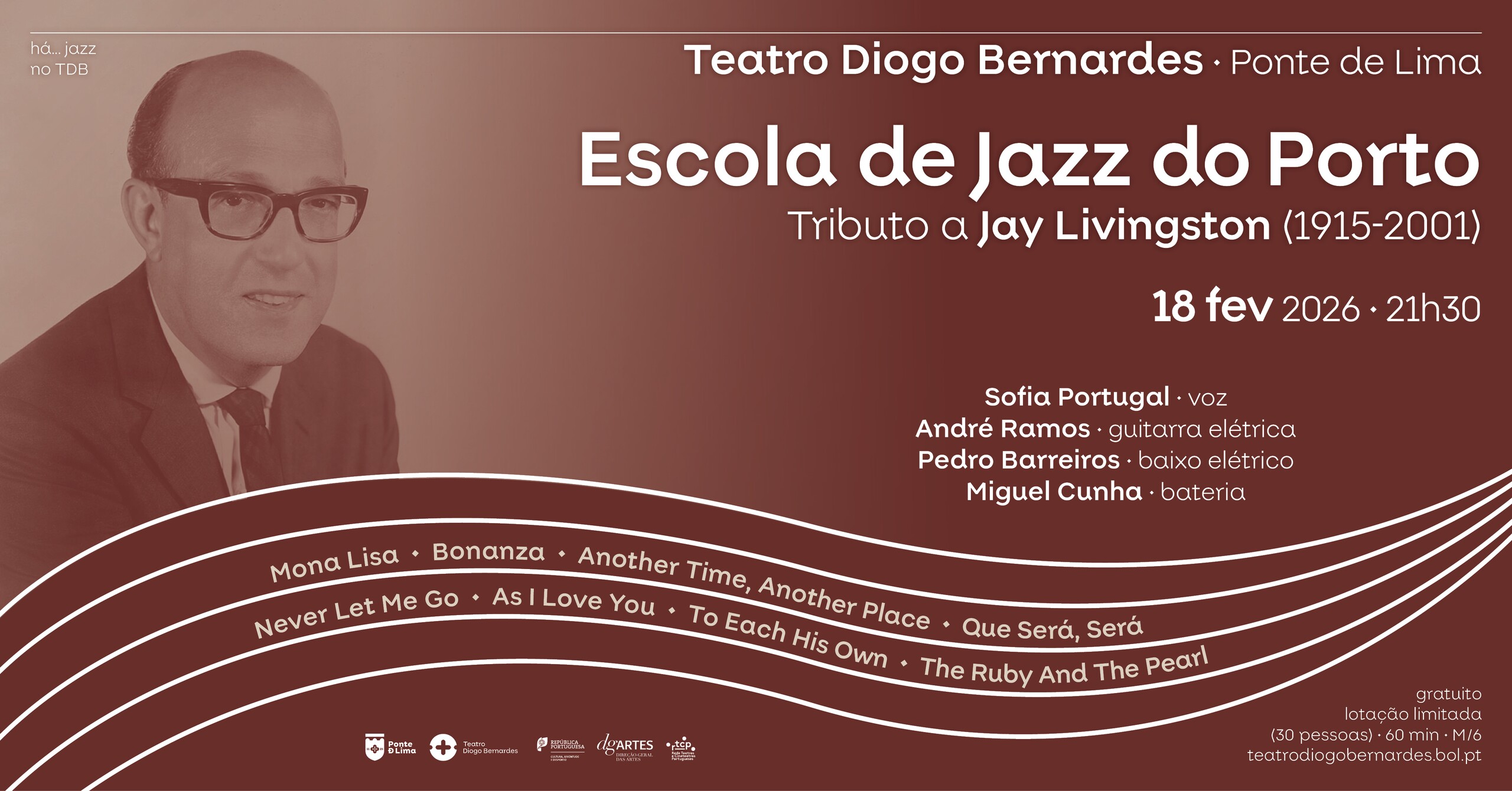 No dia 18 de fevereiro de 2026, às 21h30, o Teatro Diogo Bernardes, em Ponte de Lima, apresenta o espetáculo de Jazz, Há... Jazz no TDB – Tributo ao compositor Jay Livingston (1915-2001) pela Escola de Jazz do Porto.