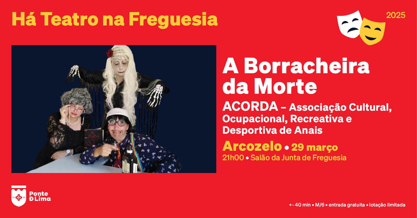 A 29 de março de 2025, às 21h00, Há Teatro na Freguesia... de Arcozelo, com o espetáculo "A Borracheira da Morte", pelo ACORDA - Associação Cultural, Ocupacional, Recreativa e Desportiva de Anais.