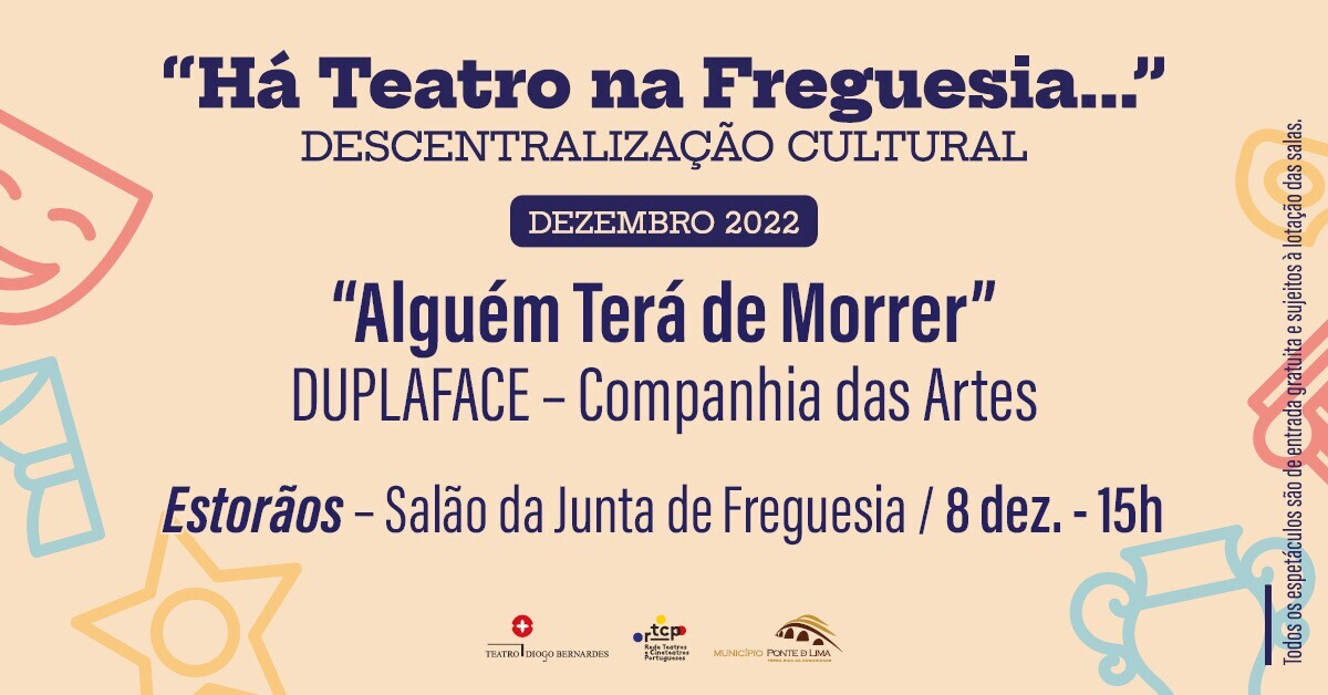 A 8 de dezembro de 2022, às 15h00, Há Teatro na Freguesia... de Estorãos, com o espetáculo "Alguém Terá de Morrer", pela DUPLAFACE - Companhia das Artes, com entradas gratuitas e sujeito à lotação da sala.