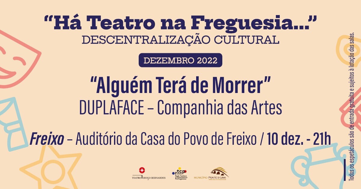 A 10 de dezembro de 2022, às 21h00, Há Teatro na Freguesia... de Freixo, com o espetáculo "Alguém Terá de Morrer", pela DUPLAFACE - Companhia das Artes, com entradas gratuitas e sujeito à lotação da sala.