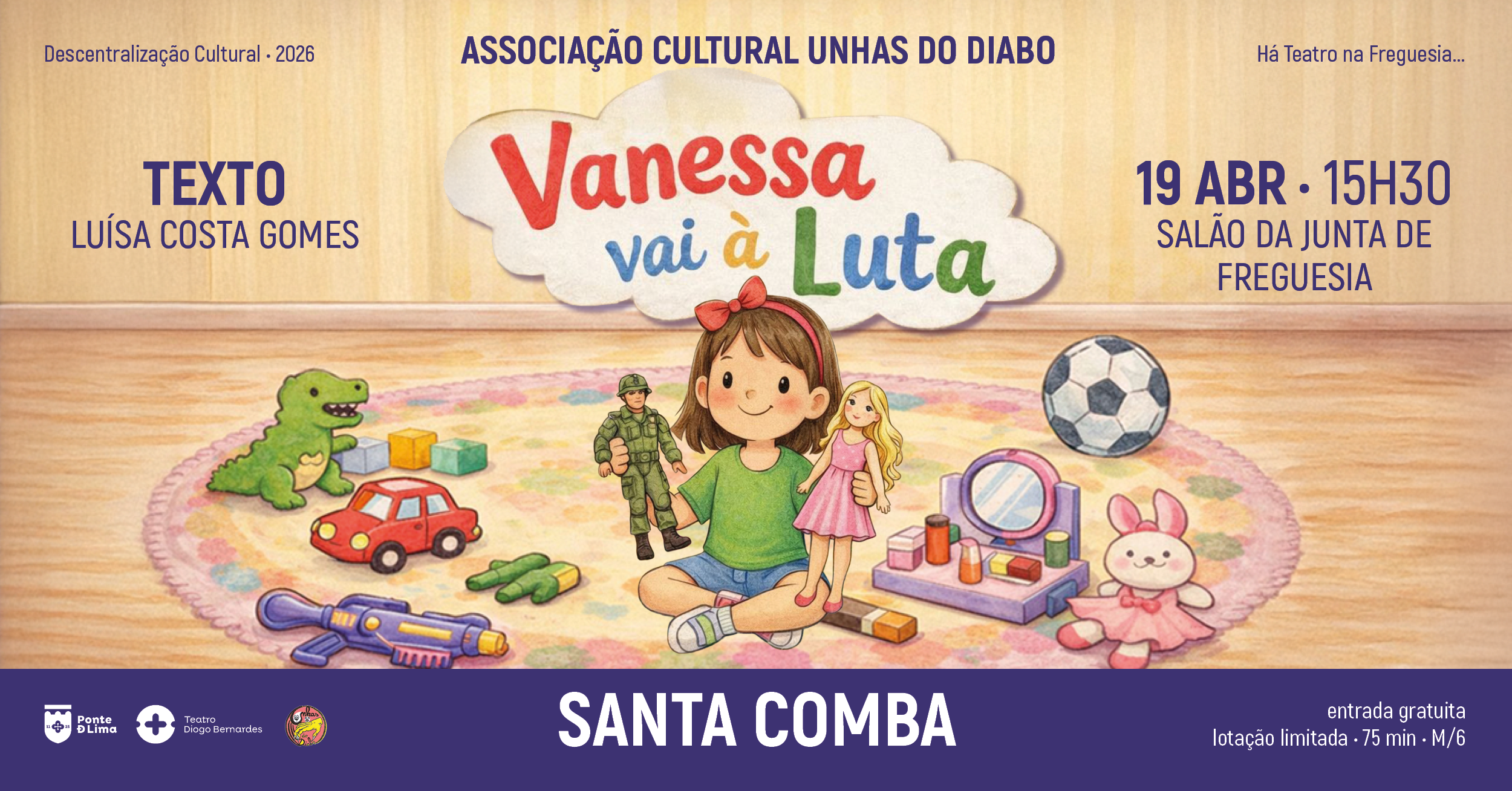 A Associação Cultural Unhas do Diabo apresenta “Vanessa Vai à Luta”, uma obra de Luísa Costa Gomes (Lisboa, 1954), que aborda, de forma crítica e divertida, os estereótipos de género e a promoção da igualdade de oportunidades. Vanessa é uma menina que sabe muito bem o que quer: sonha receber uma metralhadora como presente no seu aniversário. Contudo, vê-se confrontada com as expectativas da mãe, que defende que “há brinquedos para meninas”, como bonecas, cozinhas, carrinhos de supermercado ou aspiradores. Através do humor e da ironia, o espetáculo convida o público a refletir não só sobre as questões de género, mas também sobre o consumismo, a publicidade enganosa, a preocupação com a aparência e com a opinião dos outros. É um espetáculo atual e pertinente que questiona preconceitos enraizados e lança uma pergunta essencial: será que existem, de facto, “brinquedos para meninas e brinquedos para rapazes”?