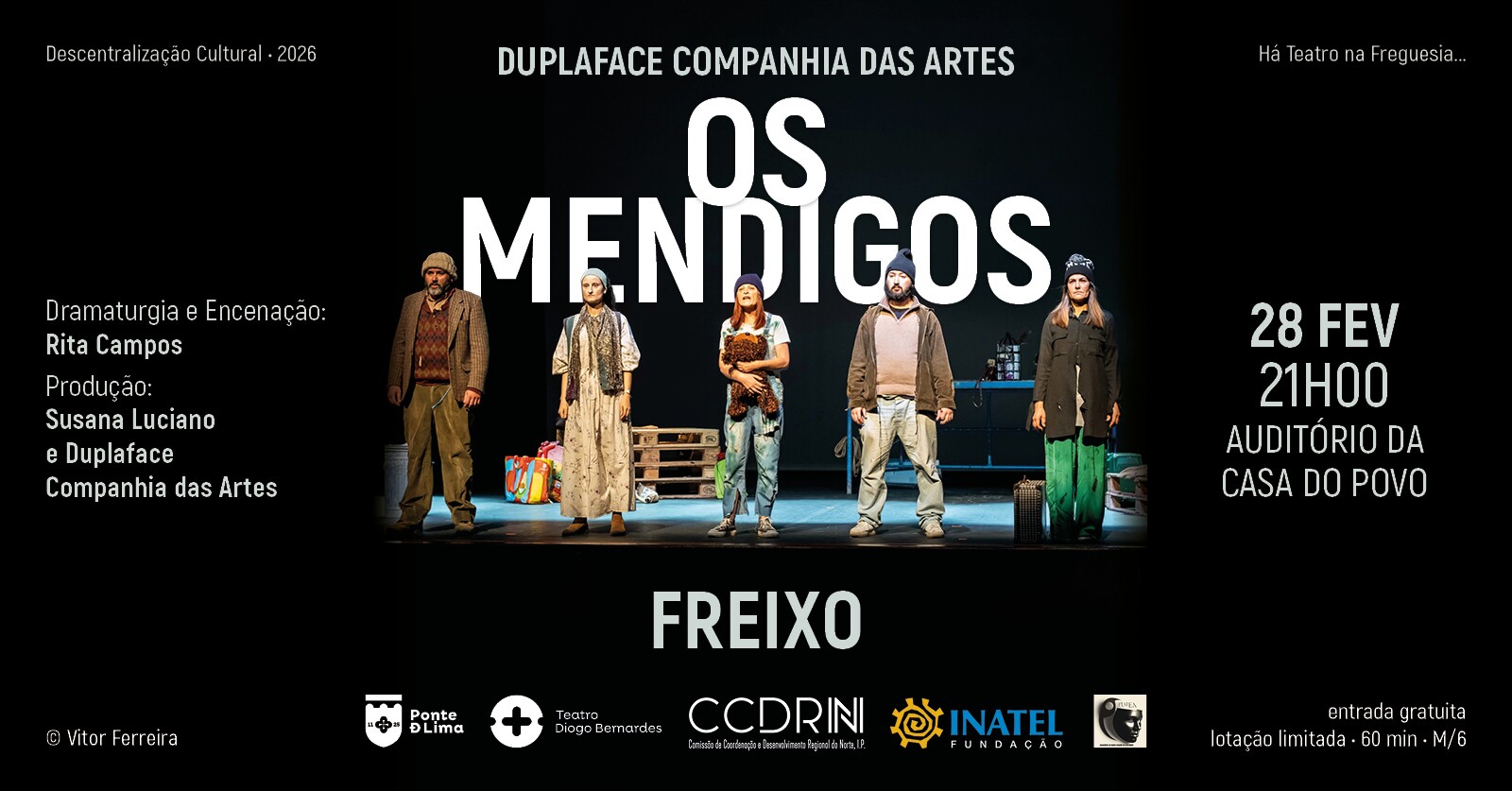 No dia 28 de fevereiro de 2026, às 21h00, Há Teatro na Freguesia... de Freixo, com o espetáculo "Os Mendigos" pela DuplaFace - Companhia das Artes, no Auditório da Casa do Povo.