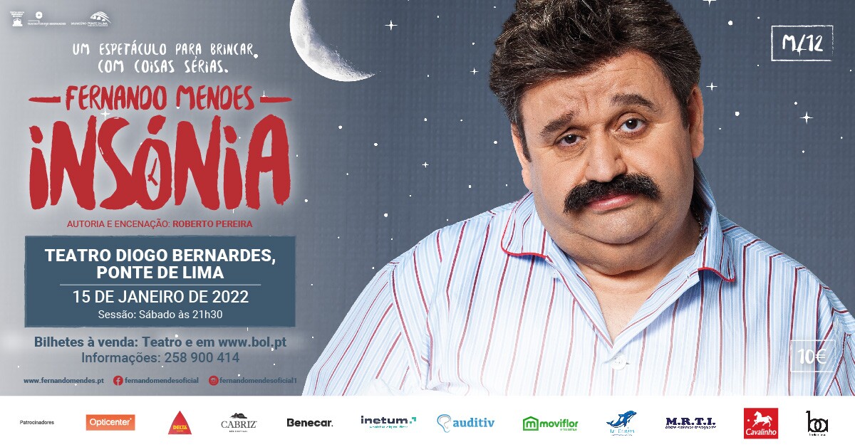 A 15 de janeiro 2022, às 21h30, o Teatro Diogo Bernardes, apresenta o espetáculo de comédia "Insónia", com Fernando Mendes.
