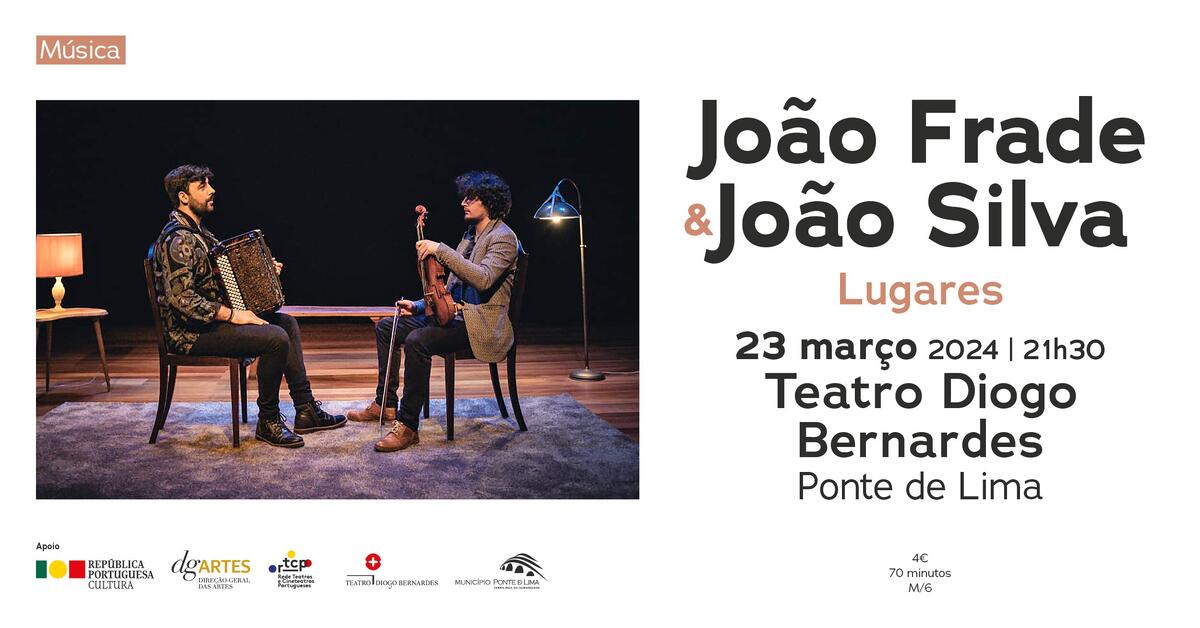 No dia 23 de março de 2024, às 21h30, o Teatro Diogo Bernardes em Ponte de Lima apresenta o espetáculo de música "Lugares" João Frade & João Silva.
